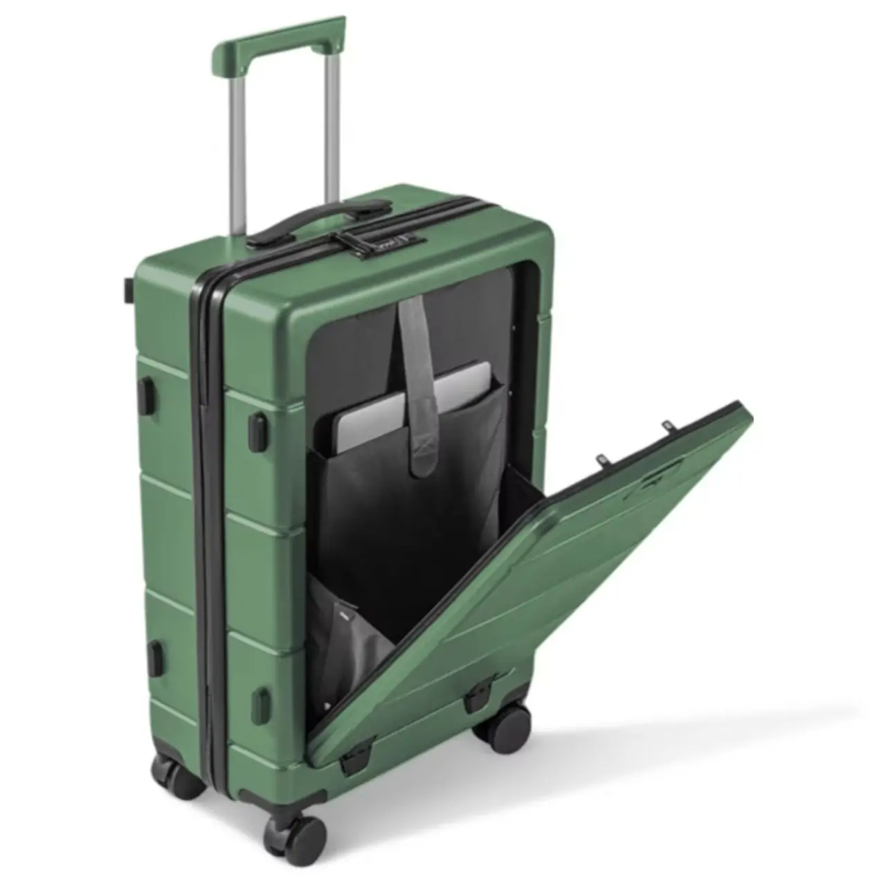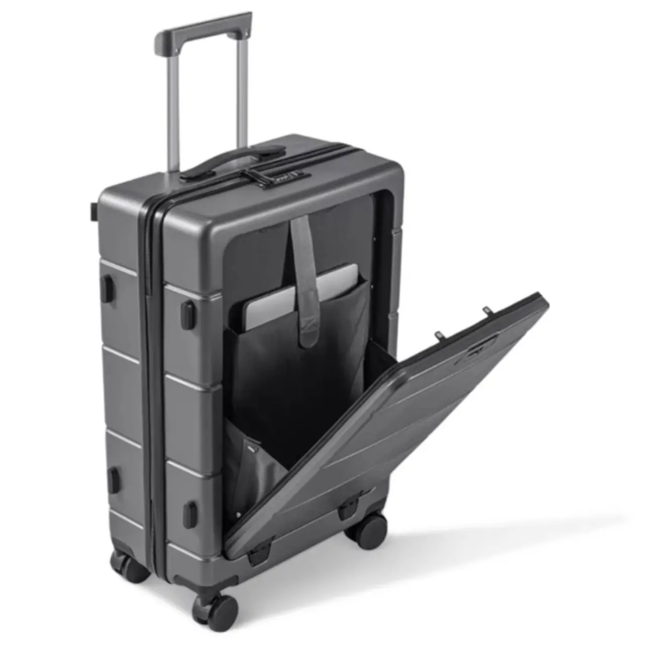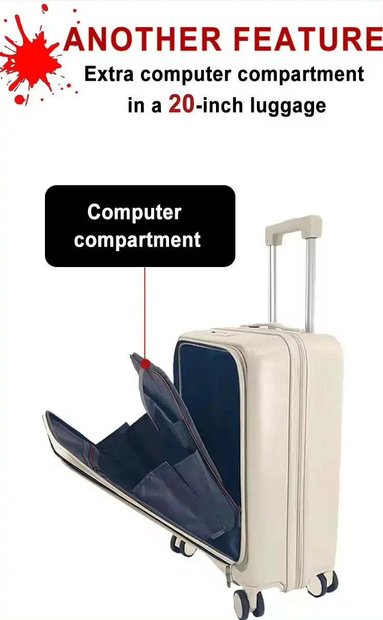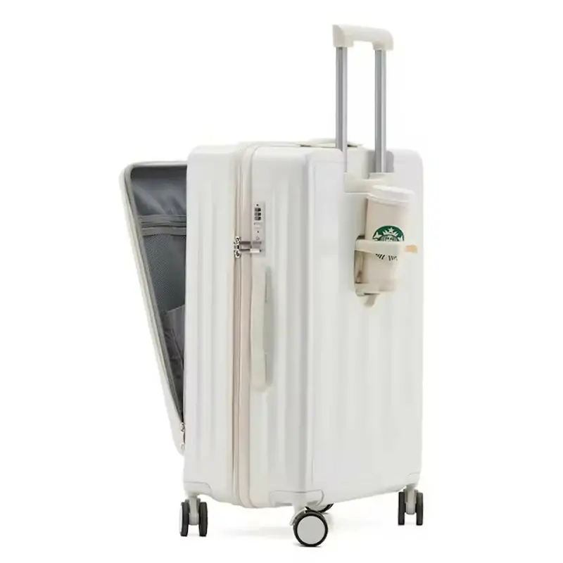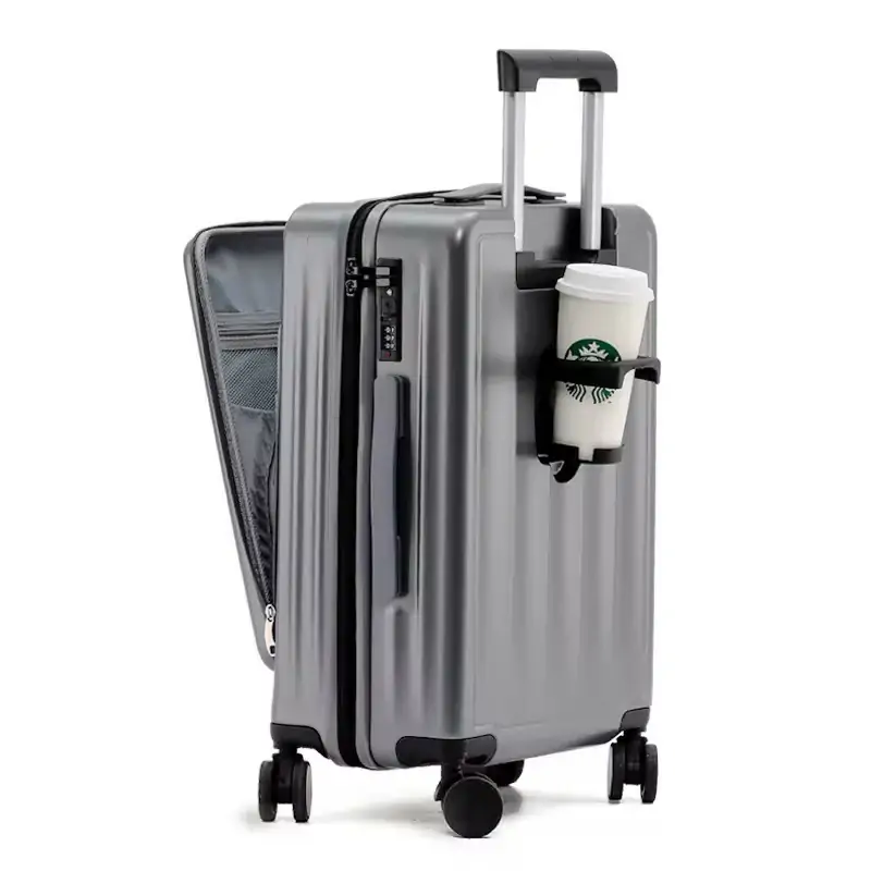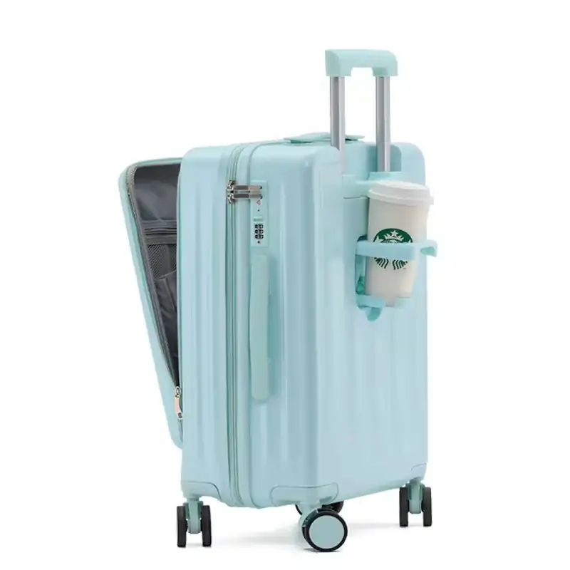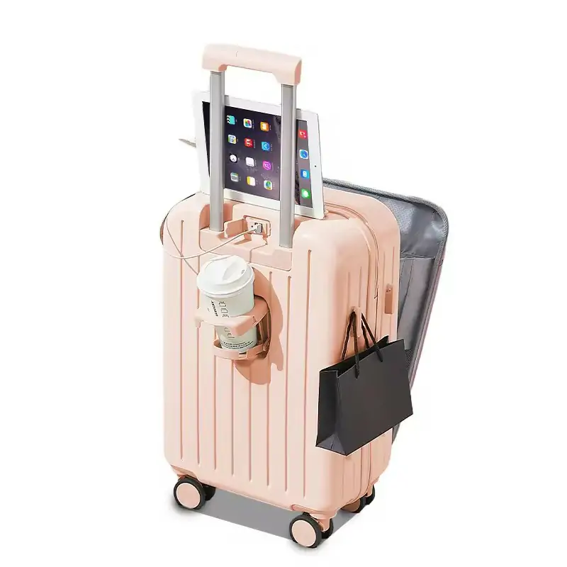 Front open luggage laptop compartment carry on luggage travel bag with cup hold trolley suitcase
